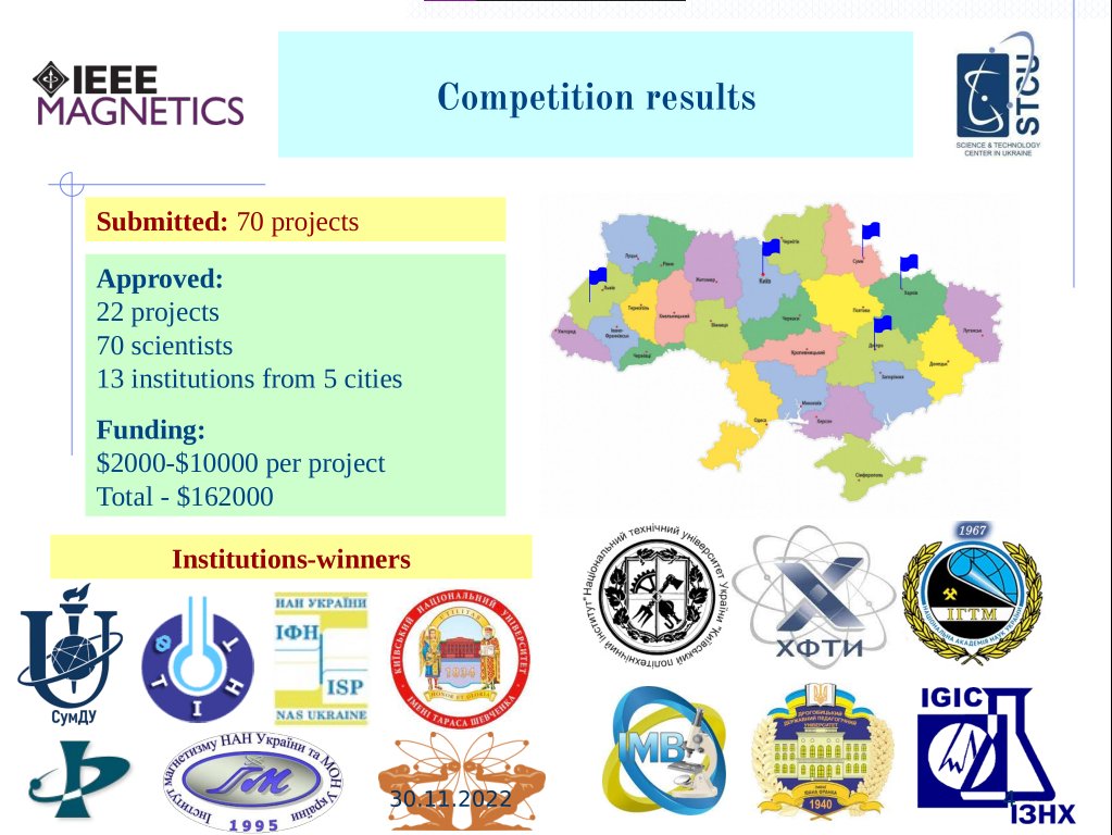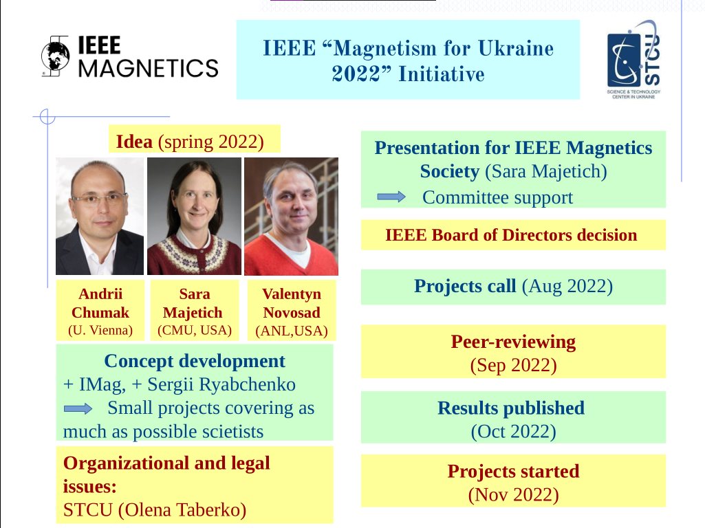 On November 14, 2024, the Institute of Magnetism hosted “Magnetism for Ukraine Initiative” Workshop. The Workshop summarized the results of the IEEE “Magnetism for Ukraine Initiative 2022-2023” − grant program, initiated by IEEE Magnetics Society and funded by IEEE with the assistance of Science and Technology Center in Ukraine. The program's goal is to support and aid in the recovery of science and technology in Ukraine, as well as to promote ongoing research and development activities in the fields related to magnetism.
